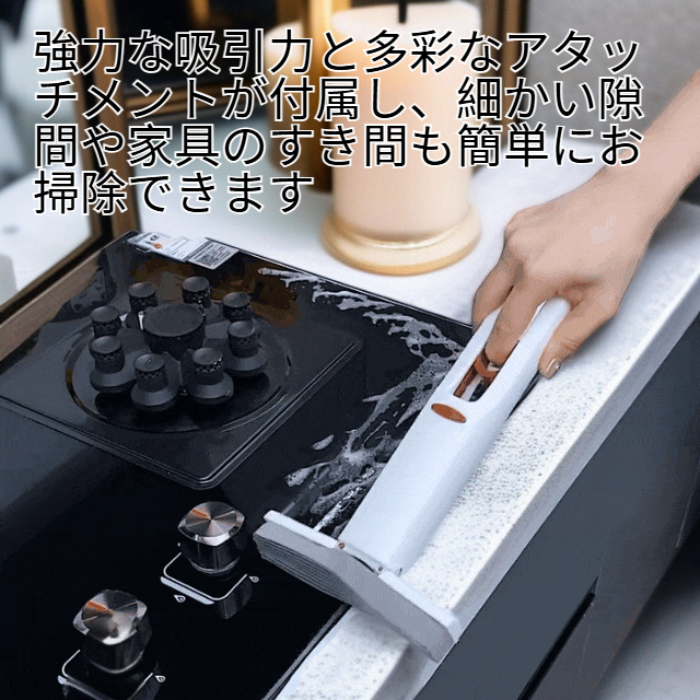 ● 強力な吸引力と多彩なアタッチメントが付属し、細かい隙間や家具のすき間も簡単にお掃除できます。