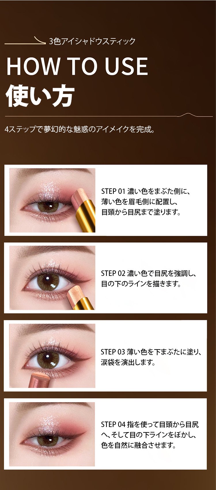 ● ひと塗りで美しいグラデーションが完成する3色アイシャドウスティックで、時短メイクが叶います。