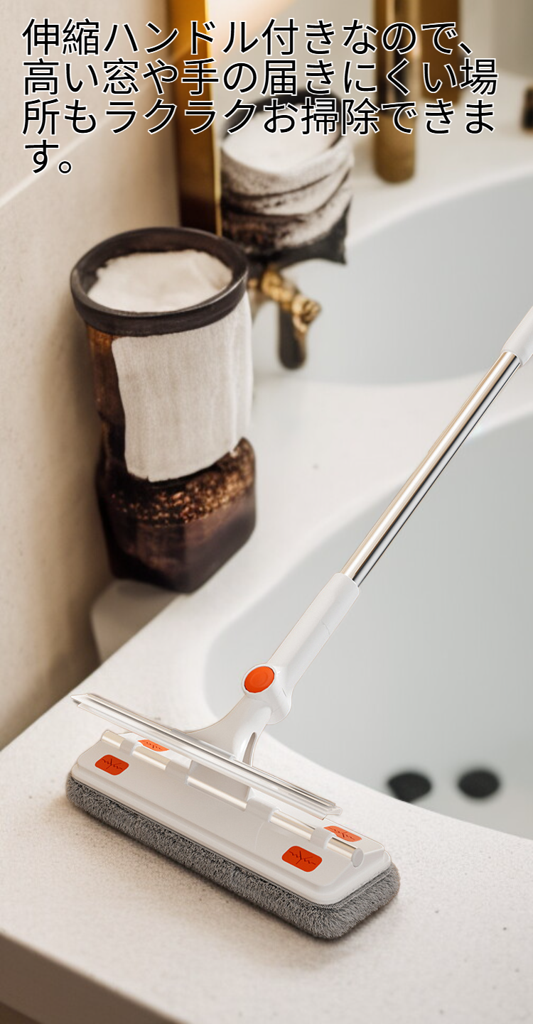 ● 伸縮ハンドル付きなので、高い窓や手の届きにくい場所もラクラクお掃除できます。